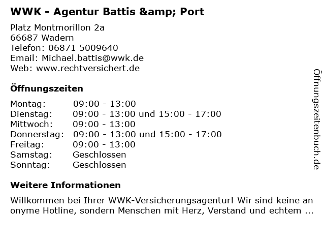 | Öffnungszeiten WWK - Agentur Battis & Port in Wadern anzeigen | |
