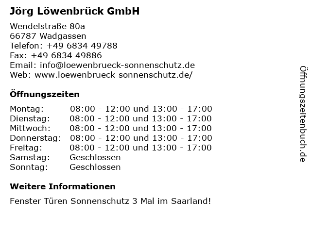 Öffnungszeiten Jörg Löwenbrück GmbH in Wadgassen anzeigen | |