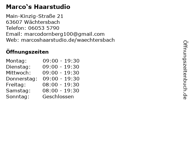| Öffnungszeiten Marco‘s Haarstudio in Wächtersbach anzeigen | |