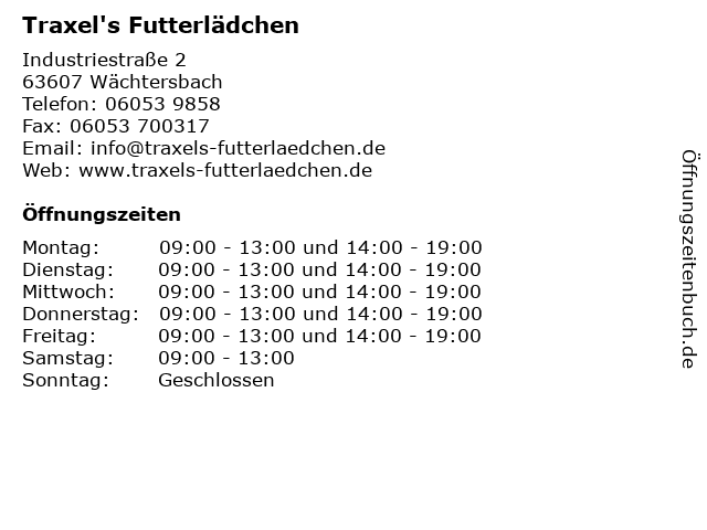 | Öffnungszeiten Traxel's Futterlädchen in Wächtersbach anzeigen | |