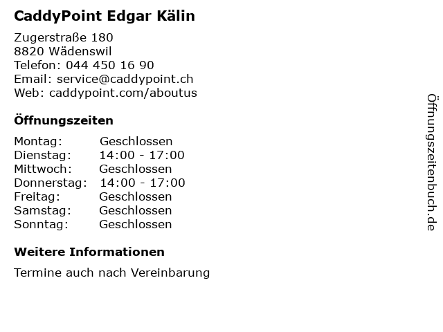 | Öffnungszeiten CaddyPoint Edgar Kälin in Wädenswil anzeigen | |