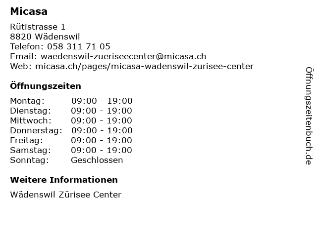 | Öffnungszeiten Micasa in Wädenswil anzeigen | |