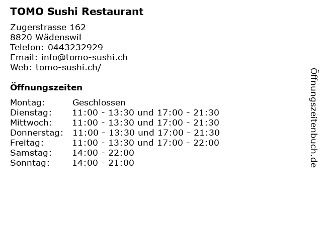 | Öffnungszeiten TOMO Sushi Restaurant in Wädenswil anzeigen | |