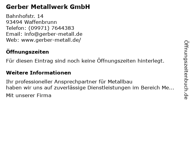| Öffnungszeiten Gerber Metallwerk GmbH in Waffenbrunn anzeigen | |
