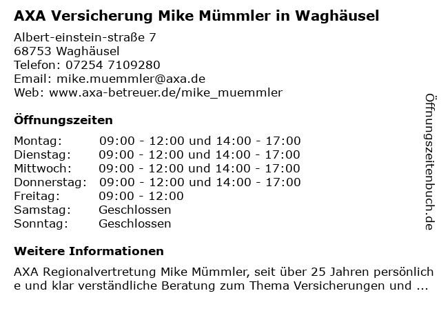 1 AXA Versicherung - Generalvertretung Thomas Käpplein (Entfernung: 2,86 km) Odenwaldstr. 14, 68753 Waghäusel 4 AXA Versicherung - Hauptvertretung Ursula Geberth (Entfernung: 6,30 km) Birkenallee 23, 68809 Neulußheim 5 AXA Versicherung - Geschäftsstelle Markus Impertro (Entfernung: 9,33 km) Stuhlbrudergasse 1, 67346 Speyer 6 AXA Versicherung - Hauptvertretung Verena Lorenz (Entfernung: 9,82 km) Untere Langgasse 23, 67346 Speyer |