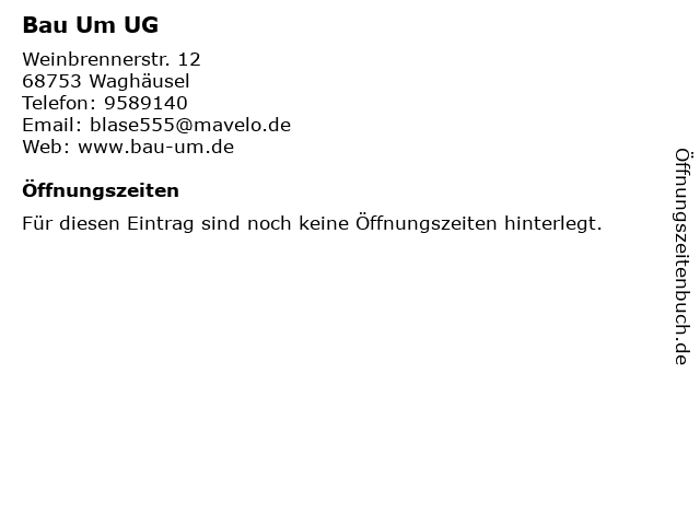 | Öffnungszeiten Bau Um UG in Waghäusel anzeigen | |
