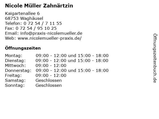 | Öffnungszeiten Nicole Müller Zahnärtzin in Waghäusel anzeigen | |