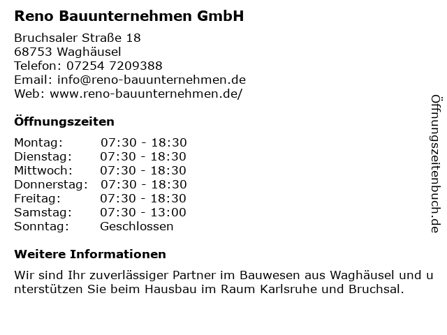 | Öffnungszeiten Reno Bauunternehmen GmbH in Waghäusel anzeigen | |