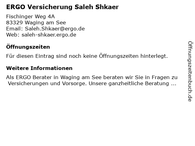 | Öffnungszeiten ERGO Versicherung Saleh Shkaer in Waging am See anzeigen | |