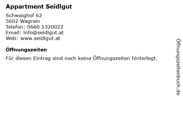 | Öffnungszeiten Appartment Seidlgut in Wagrain anzeigen | |