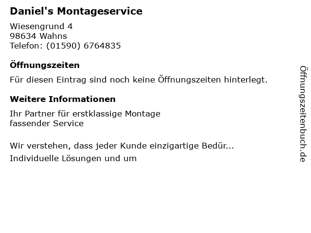 | Telefonnummer Daniel's Montageservice in Wahns ((01590) 6764835) anrufen | |