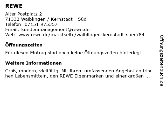 Hinweis: Groß, modern, vielfältig. Mit ihrem umfassenden Angebot an frischen Lebensmitteln, den REWE Eigenmarken und einer großen Getränkeauswahl, bieten REWE Supermärkte alles was Sie brauchen an einem Ort.