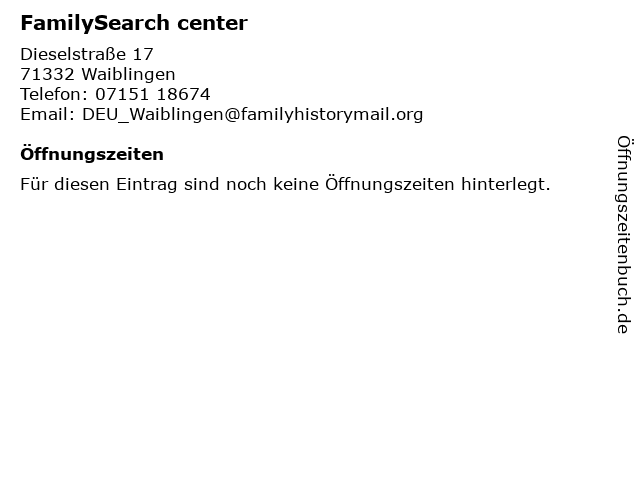 | Öffnungszeiten FamilySearch center in Waiblingen anzeigen | |