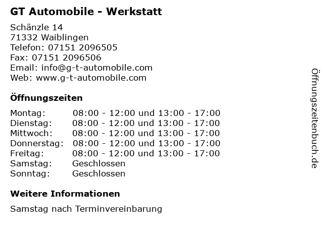 Öffnungszeiten GT Automobile - Werkstatt in Waiblingen anzeigen | |