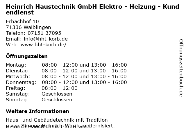 1 Heinrich Haustechnik GmbH Elektro - Heizung - Kundendienst (Entfernung: 2,57 km) Steinstr. 23, 71404 Korb 5 Autohaus Graf GmbH - Kundendienst & Teile und Zubehör (Entfernung: 6,51 km) Industriestraße 15, 71364 Winnenden 6 Blocherer & Steinhauser GmbH Elektro-Heizung-Sanitär Kundendienst (Entfernung: 7,01 km) Rainwiesen 8, 71686 Remseck |
