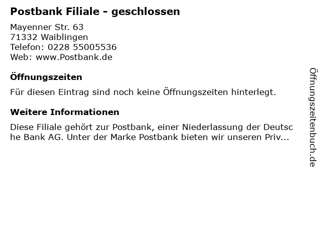 Öffnungszeiten Postbank Filiale - geschlossen in Waiblingen anzeigen