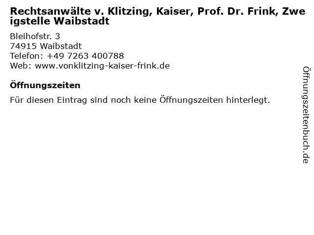 | Rechtsanwälte v. Klitzing, Kaiser, Prof. Dr. Frink, Zweigstelle Waibstadt anrufen | |