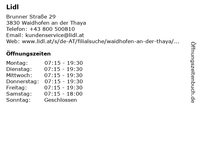 | Öffnungszeiten Lidl in Waidhofen an der Thaya anzeigen | |
