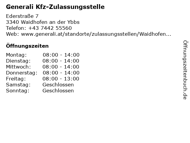 | 2 Garanta Zulassungsstelle Waidhofen an der Ybbs (Entfernung: 0,10 km) Ybbsitzerstraße 39/4, 3340 Waidhofen an der Ybbs 4 Generali - Kfz-Zulassungsstelle (Neufurth, Autohaus Senker) (Entfernung: 14,09 km) Rauscherstraße 45, 3363 Ulmerfeld-Hausmening 5 Generali Kfz-Zulassungsstelle Neufurth - Autohaus Senker (Entfernung: 14,10 km) Rauscherstraße 45, 3363 Ulmerfeld-Hausmening 6 UNIQA GeneralAgentur Peham OG & Kfz Zulassungsstelle (Entfernung: 14,54 km) Holzstraße 4, 3363 Neufurth |