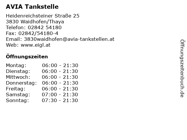 | Öffnungszeiten AVIA Tankstelle in Waidhofen/Thaya anzeigen | |
