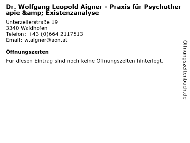 1 Dr. Wolfgang Leopold Aigner - Praxis für Psychotherapie & Existenzanalyse (Entfernung: 19,57 km) Feldstraße 13, 3300 Amstetten 6 |