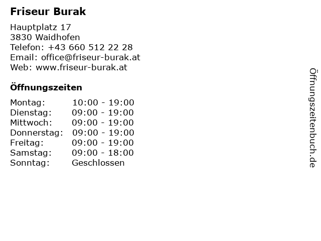 | Öffnungszeiten Friseur Burak in Waidhofen anzeigen | |
