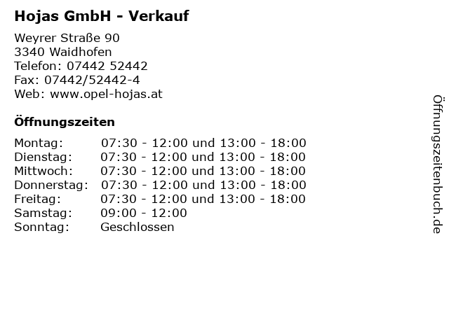 | Öffnungszeiten Hojas GmbH - Verkauf in Waidhofen anzeigen | |