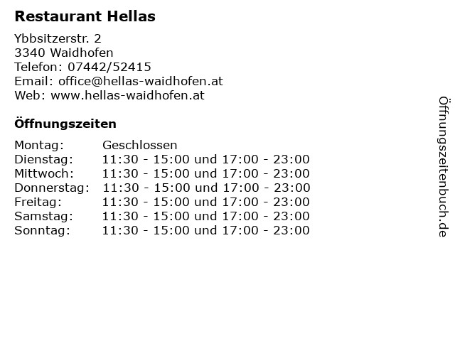 | Öffnungszeiten Restaurant Hellas in Waidhofen anzeigen | |