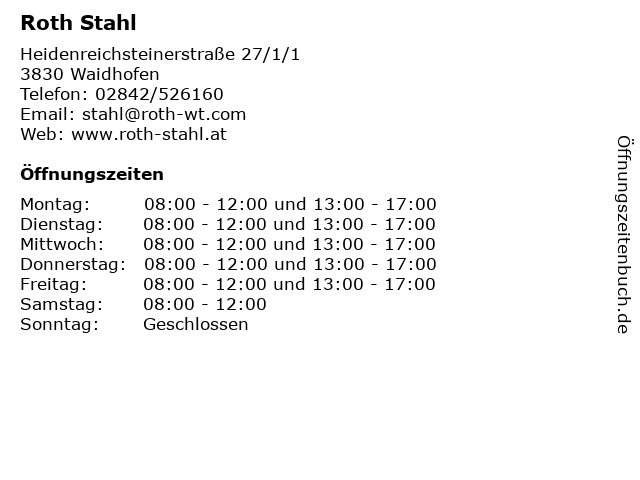| Öffnungszeiten Roth Stahl in Waidhofen anzeigen | |