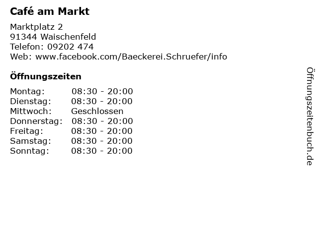 | Öffnungszeiten Café am Markt in Waischenfeld anzeigen | |