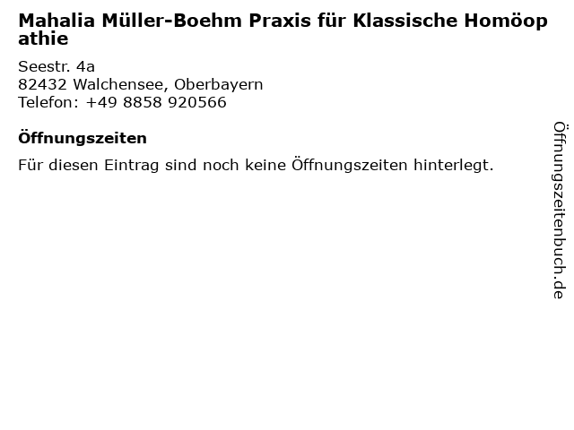 | Mahalia Müller-Boehm Praxis für Klassische Homöopathie anrufen | |