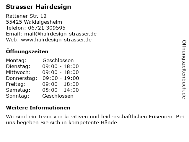 | Öffnungszeiten Strasser Hairdesign in Waldalgesheim anzeigen | |