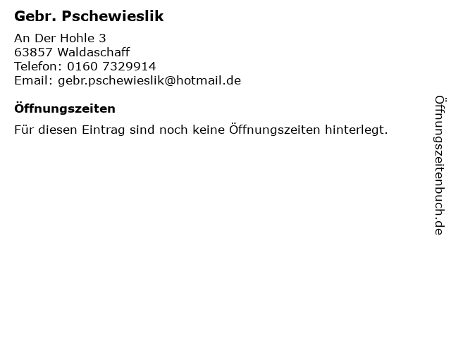 | Öffnungszeiten Gebr. Pschewieslik in Waldaschaff anzeigen | |