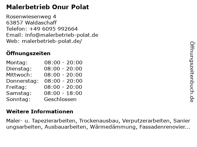 | Öffnungszeiten Malerbetrieb Onur Polat in Waldaschaff anzeigen | |
