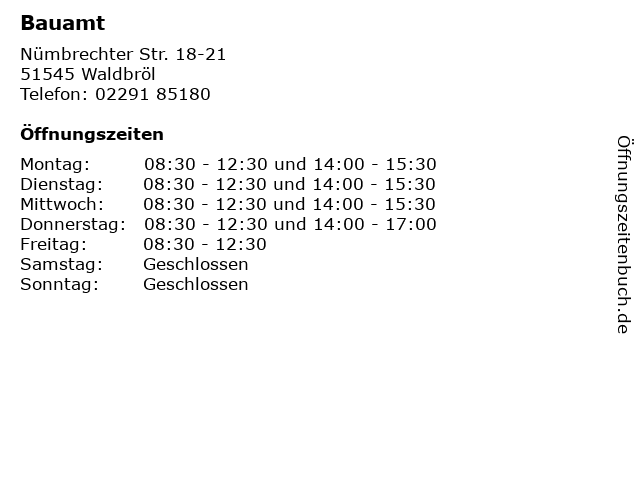 | Öffnungszeiten Bauamt in Waldbröl anzeigen | |