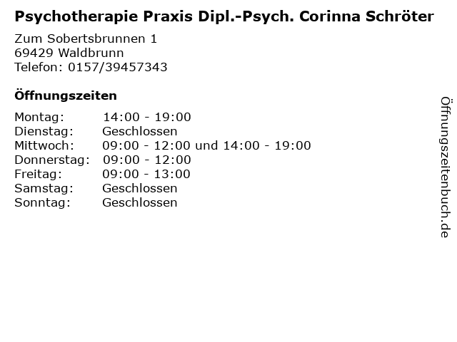 1 Psychotherapie Praxis Dipl.-Psych. Marcus Wagner (Entfernung: 11,11 km) Konrad-Adenauer-Str. 11, 74821 Mosbach 2 Dr. Dipl.-Psych. Klaus Roos Psychotherapeutische Praxis (Entfernung: 11,59 km) Bahnhofstr. 12, 74834 Elztal 4 5 Psychotherapie Praxis Dipl.-Psych. Jana Kastner (Entfernung: 13,50 km) Carl-Theodor-Str. 11, 74821 Mosbach 6 Psychotherapie Praxis Dipl.-Psych. Kerstin Stickel (Entfernung: 13,50 km) Carl-Theodor-Str. 11, 74821 Mosbach |