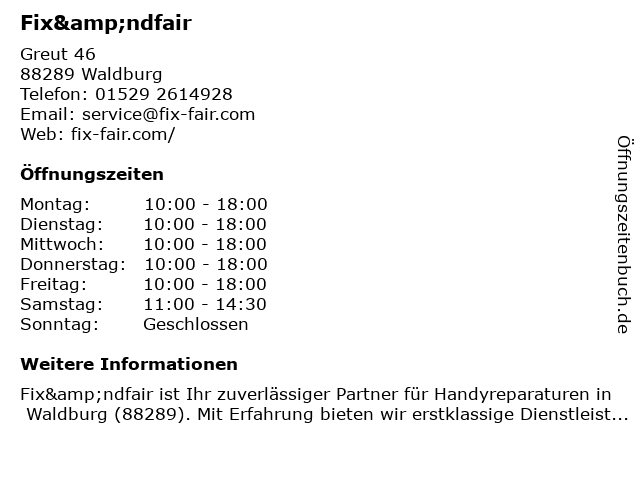 | Öffnungszeiten Fix&ndfair in Waldburg anzeigen | |