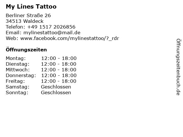 | Öffnungszeiten My Lines Tattoo in Waldeck anzeigen | |