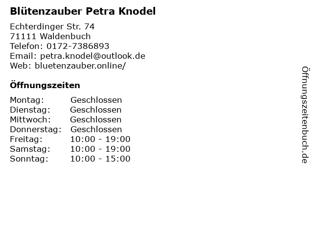 | Öffnungszeiten Blütenzauber Petra Knodel in Waldenbuch anzeigen | |
