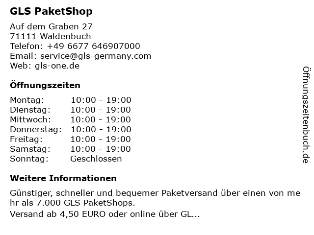 | Öffnungszeiten GLS PaketShop in Waldenbuch anzeigen | |