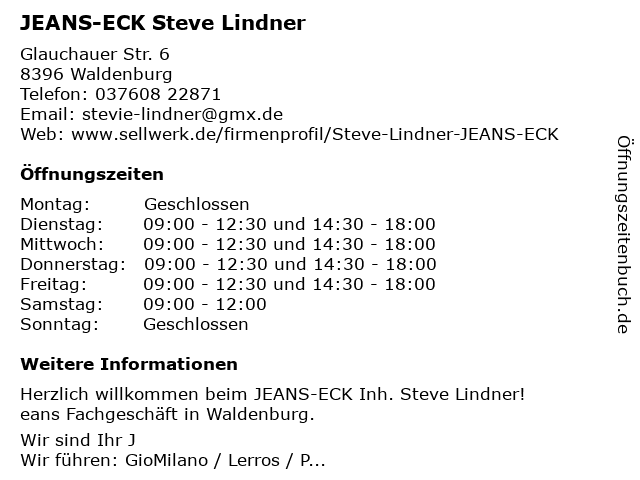 | Öffnungszeiten JEANS-ECK Steve Lindner in Waldenburg anzeigen | |