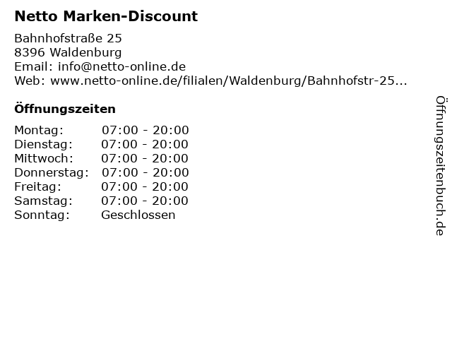 | Öffnungszeiten Netto Marken-Discount in Waldenburg anzeigen | |