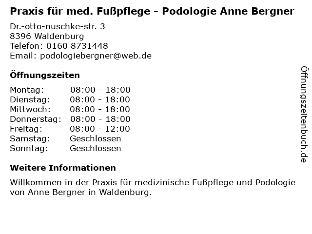 Branchen & Suchbegriffe zu Praxis für med. Fußpflege - Podologie Anne Bergner:anne, bergner, fußpflege, med., podologie, praxis |