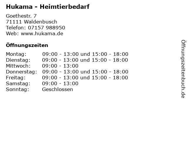 | Öffnungszeiten Hukama - Heimtierbedarf in Waldenbusch anzeigen | |