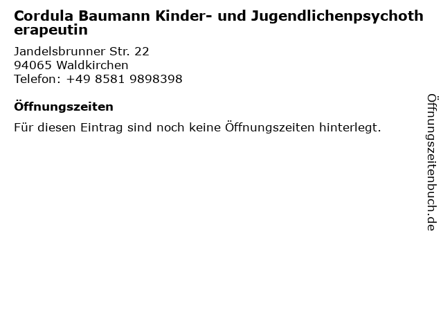 | Cordula Baumann Kinder- und Jugendlichenpsychotherapeutin anrufen | |