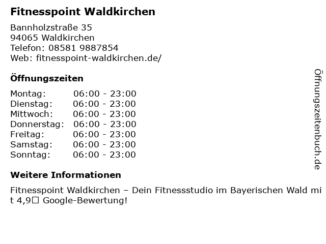 | Öffnungszeiten Fitnesspoint Waldkirchen in Waldkirchen anzeigen | |
