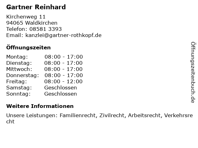 | Öffnungszeiten Gartner Reinhard in Waldkirchen anzeigen | |