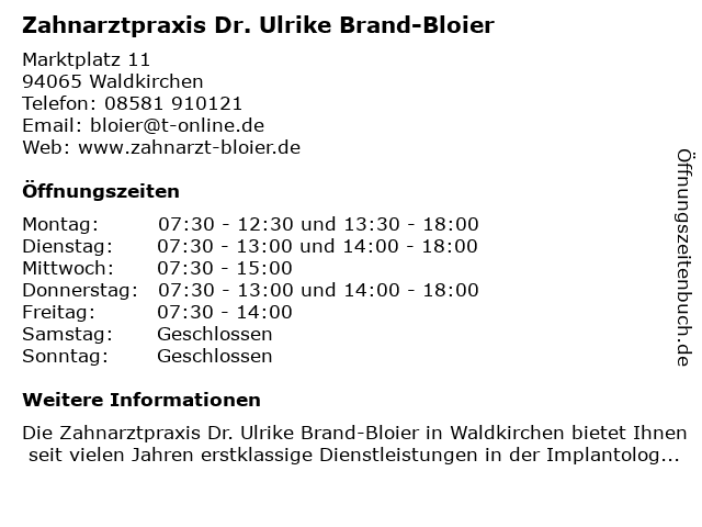 | 1 Zahnärztliche Gemeinschaftspraxis Karl Bloier und Dr. Ulrike Brand-Bloier (Entfernung: 0,01 km) Marktplatz 11, 94065 Waldkirchen 6 Zahnarztpraxis Rajec (Bayerwaldzahn MVZ Tittling) (Entfernung: 16,20 km) Marktplatz 5, 94104 Tittling |