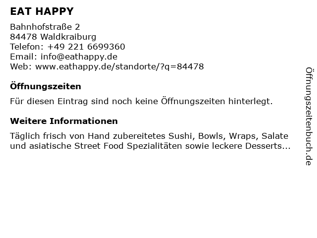 | Öffnungszeiten EAT HAPPY in Waldkraiburg anzeigen | |