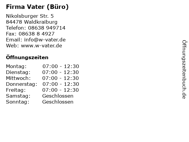 | Öffnungszeiten Firma Vater (Büro) in Waldkraiburg anzeigen | |